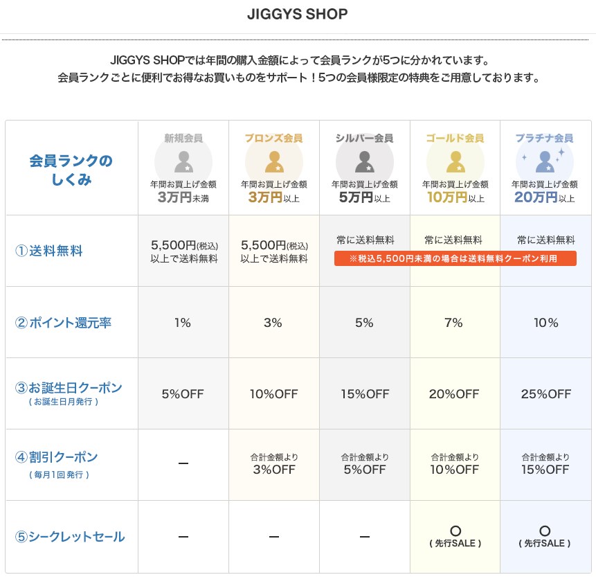 いろんな通販サイトでも扱っているJIGGYSではありますが、 公式サイトで購入するのが一番お得だったりします 会員ランク制度による各種特典や、送料サービス、ポイント還元などなど 購入を考えている方は必ず公式サイトをチェックしてみてください! |